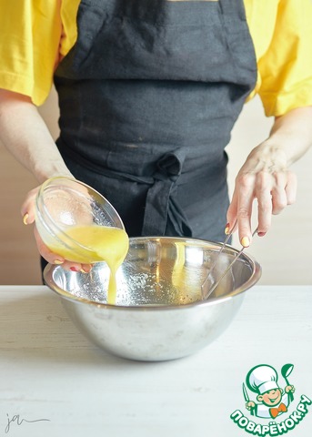 Добавить масло, растопленное и остуженное до комнатной температуры.