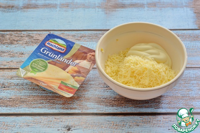 Натрите на мелкой тёрке вкусный полутвёрдый сыр. У меня Грюнландер от Хохланд. Добавьте измельченный чеснок и майонез, перемешайте.