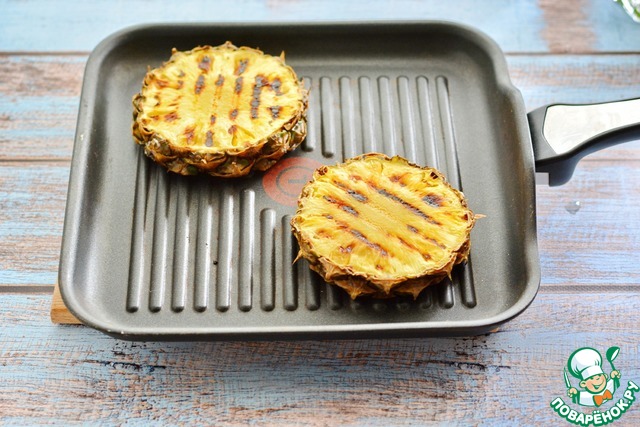 На раскалённой гриль-сковороде или на решётке гриля поджарьте кружочки ананаса до характерных полосок примерно по 3-5 минут с каждой стороны.