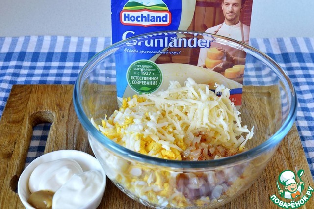 В миске соединить натертые на крупной терке сыр и яйца, добавить жареный лук. Заправить смесью майонеза, йогурта и горчицы. Перемешать, приправить по вкусу.