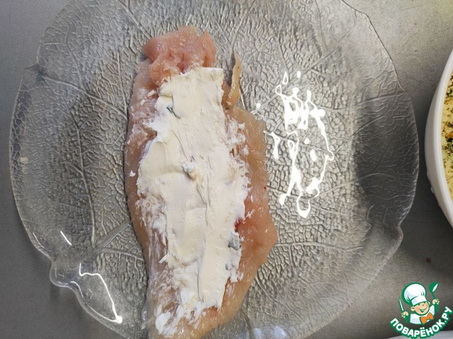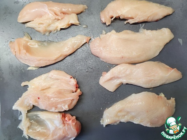 Куриную грудку разделить на 8 частей, разрезая горизонтально