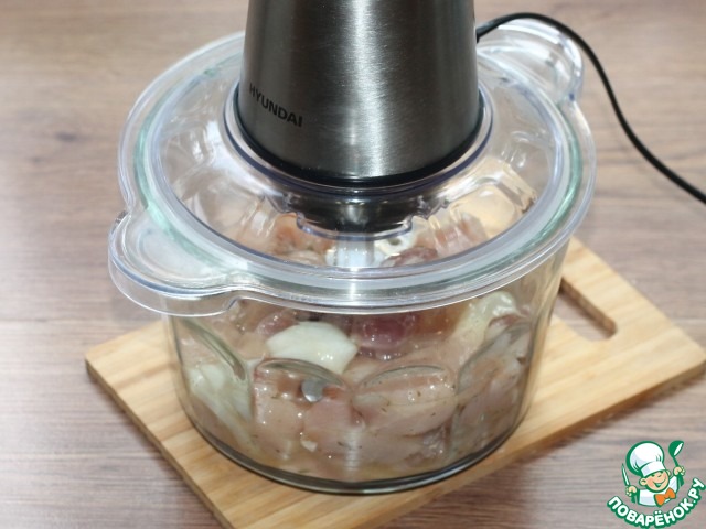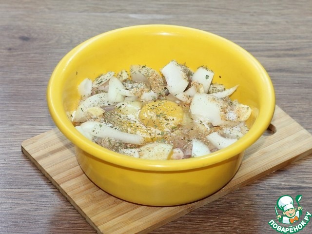 3. Добавить крупно порезанный лук (0,5 шт), чеснок (1 зуб), 1 яйцо, приправу для мяса (0,5 ч. л.), молотый перец, соль и перемешать.