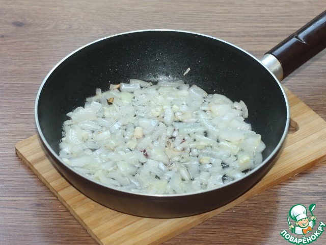5. Приготовим гарнир. Рис отварить до полуготовности. На разогретом растительном масле обжарить порезанный кубиками лук (0,5 шт). Через 2 минуты добавляем чеснок, обжариваем до появления аромата, 2-3 минуты.
