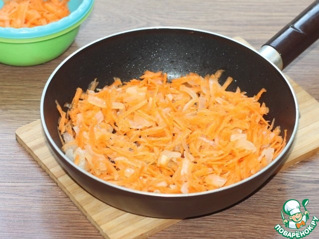 6. На крупной терке трем морковь. 2 ст. л. моркови кладем в миску с фаршем, остальное добавляем в зажарку с кусочком сливочного масла (1 ст. л.), солим, перчим и посыпаем приправой для овощей (0,5 ч. л.), тушим до готовности, минуты 2 - 3.