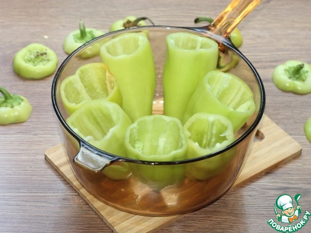 10. Подготовим перец. Срезаем у перца верхушку и очищаем от семян. Прокалываем перцы деревянной шпажкой (5-7 раз), чтобы при запекании начинка была сочной и пропитана соусом.
