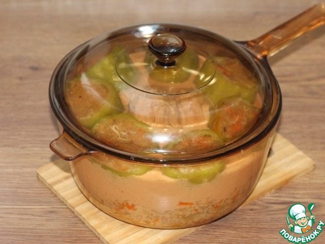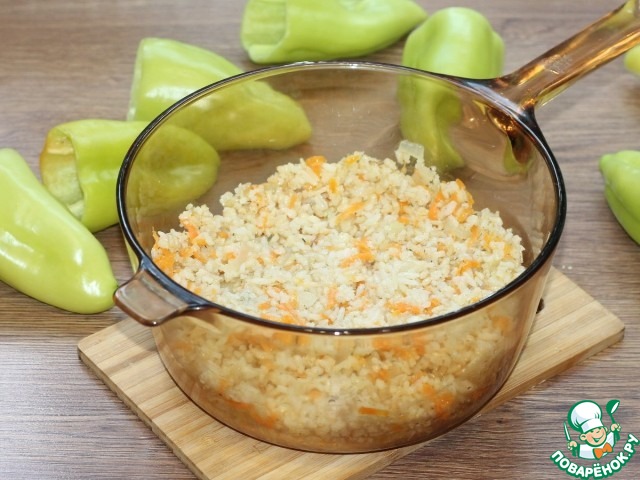12. Затем раскладываем перцы, заполненные фаршем. Если остался фарш, его можно смешать с рисовым гарниром или слепить шарики, обвалять в сухарях и выложить в середину.