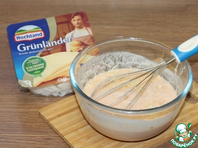 13. Для соуса смешиваем сметану с томатной пастой, прессованным зубчиком чеснока, сыром (2/3 части) и водой. Добавляем по вкусу соль, перец и щепотку сахара.