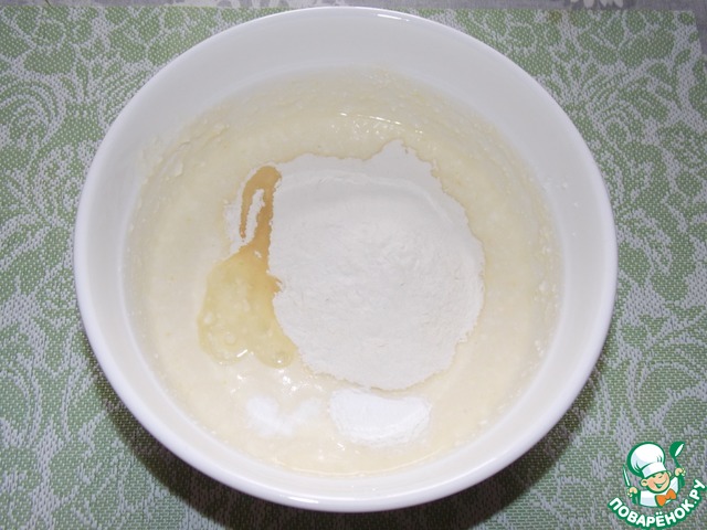 Добавить растительное масло, разрыхлитель, ванильный сахар и муку.