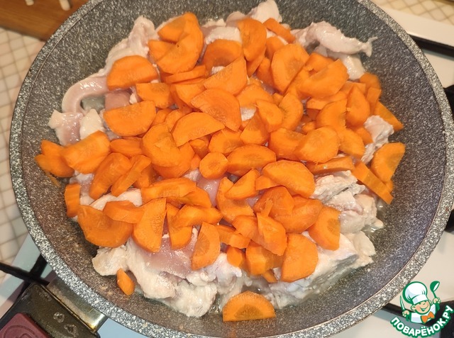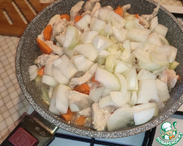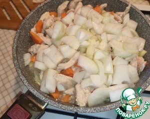 Лук нарезать крупными кубиками, отправить к куриному филе и моркови. Обжариваем 3-4 минуты.