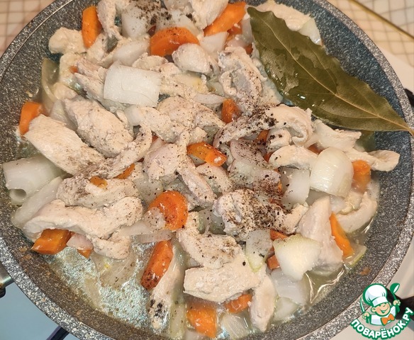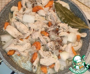 Добавить лавровый лист, специи для курицы, влить воду. Посолить и поперчить по вкусу. Хорошо перемешать. Накрыть крышкой и тушить на небольшом огне 10 минут.