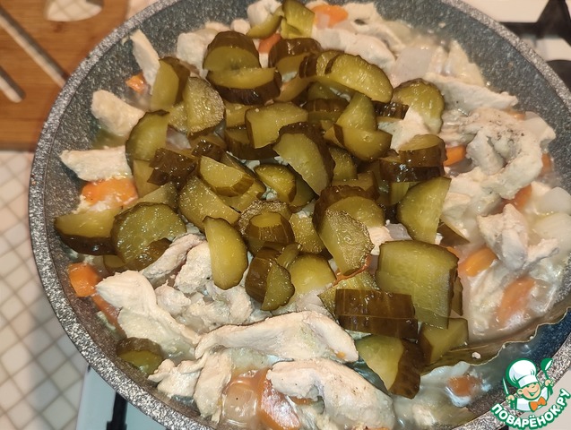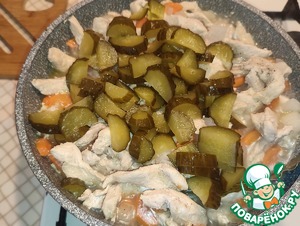 Добавить нарезанные полукольцами солёные огурцы. Готовить 7 минут.