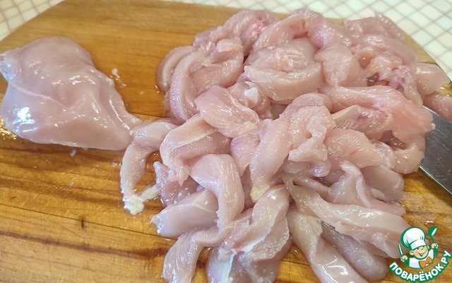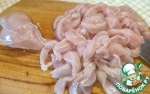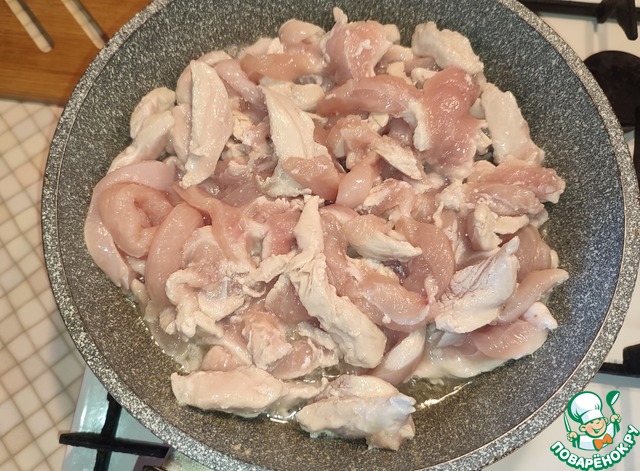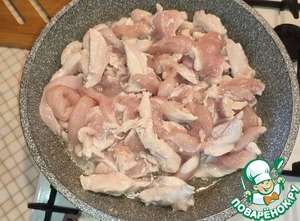 В глубокую разогретую сковороду налить растительное масло. Обжарить 3-4 минуты на среднем огне нарезанное филе.