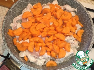 Добавить в сковороду нарезанную полукольцами морковь. Перемешать. Обжарить 4-5 минут.