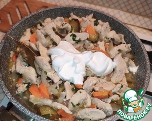 Добавить в сковороду нарезанную петрушку и сметану. Хорошо перемешать и ещё потушить на небольшом огне 10-15 минут. Готово.