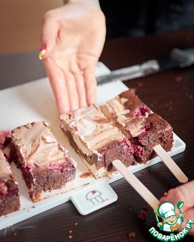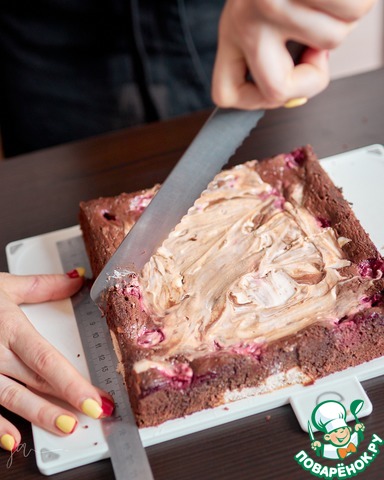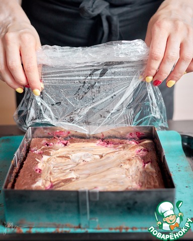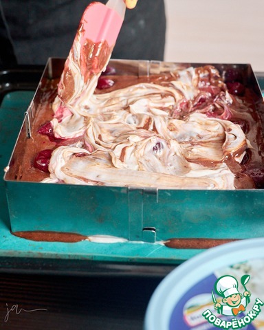 Духовку разогреть до 180С. Выложить в рамку 18*18 половину чизкейка, залить брауни.