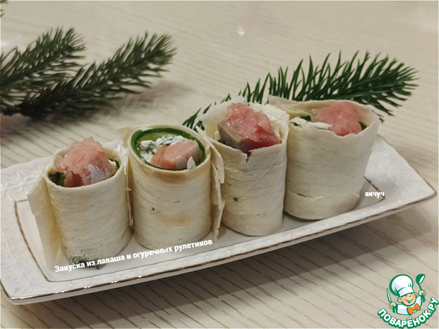 Рецепт «Закуска из лаваша и огуречных рулетиков»: