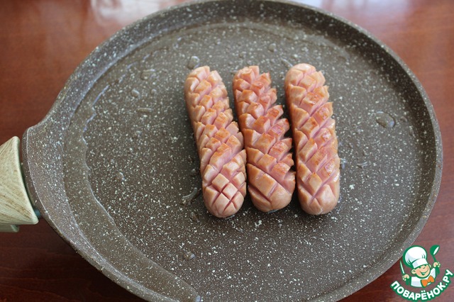 На сосисках сделайте не глубокие надрезы и обжарьте со всех сторон на растительном масле ( 1 ст. л ). Готовые сосиски положите на бумажное полотенце, чтобы удалить излишки растительного масла.
