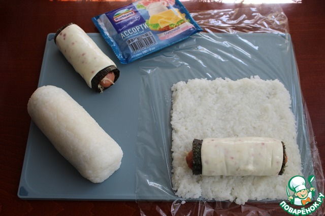 Уложите рулет с одного края и с помощью пленки, сформируйте хот-дог таким образом, чтобы он со всех сторон был покрыт рисом.