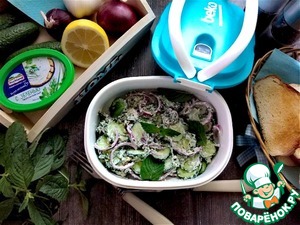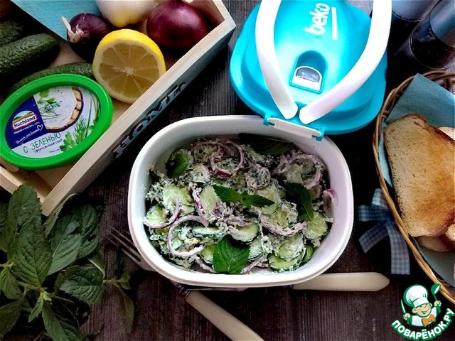Салат из огурцов с красным луком с пикантной сырной заправкой, который легко приготовить на пикнике и подать к шашлыку, как самостоятельное блюдо и к тостам.