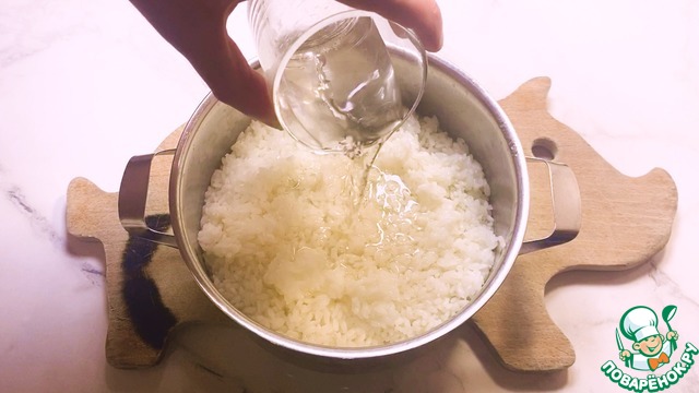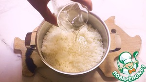 Потом в рис заливаем рисовую заправку, перемешиваем и оставляем остыть.