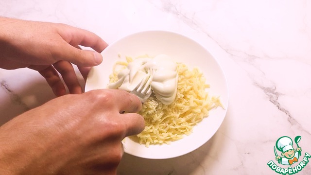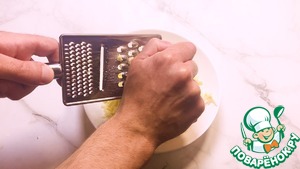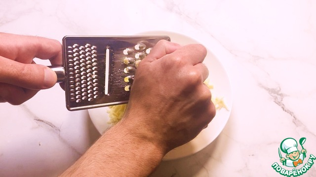Пока рис остываем готовим сырную шапочку для этого твердый сыр натираем на крупной терке.