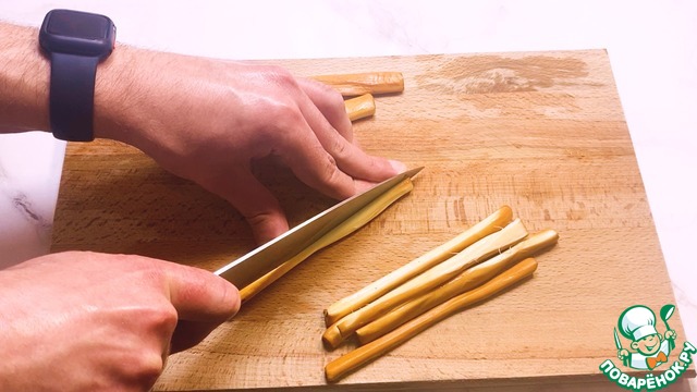После чего копченый сыр нарезаем тоненькими полосочками.
