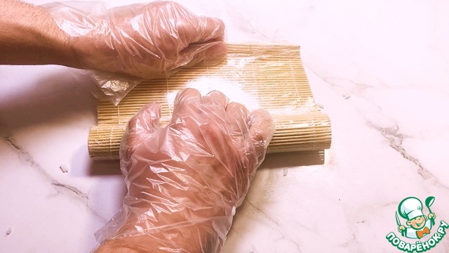 Затем на лист нори выкладываем рис, на рис кладем сыр и сворачиваем роллы.
