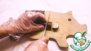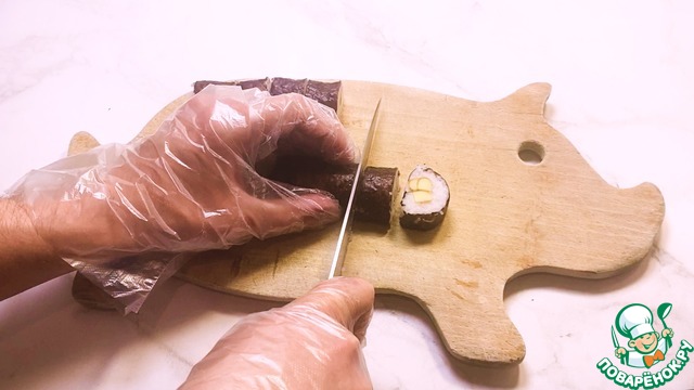 Потом нарезаем на удобные для поедания кусочки при помощи мокрого ножа.