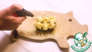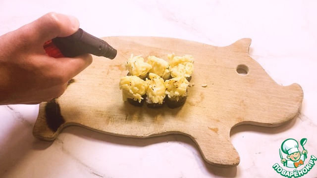 После чего на суши выкладываем сырную шапочку и оплавляем при помощи газовой горелки.