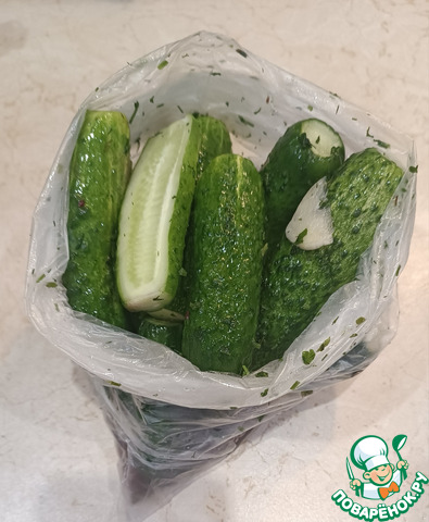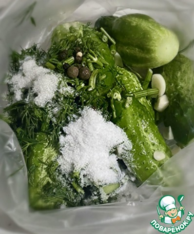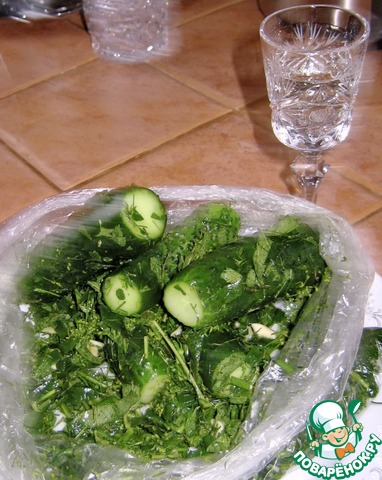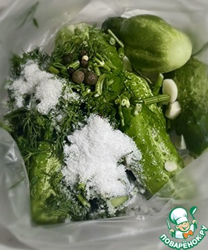 Всё сложил в пакет, потряс, в смысле перетряхнул, чтобы содержимое равномерно распределилось. Все закладываемые инди... инриди... тьфу ты, не выговорить на трезвую голову, в общем, всё, что в пакет было сложено, должно быть в идеале – совершенно СВЕЖИМ!!! Только тогда будет достигнута цель! Огурцы получаются изумительного свеже - малосольного вкуса... Никакой жидкости. Всё само собой появится. Эти огурчики будут ГОТОВЫ ЧЕРЕЗ 1.5-2 часа. Хрустят 2-3 дня, если доживут, но это вряд ли.