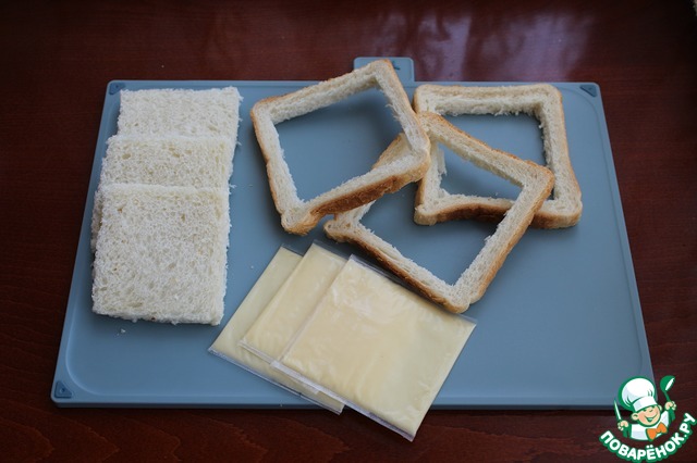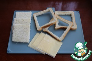 В каждом ломтике хлеба для тостов, вырежьте середину таким размером, равную размеру сырного ломтика.