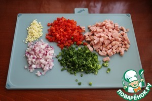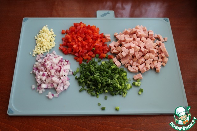 Сосиски, половину красной луковицы, 1/3 часть болгарского перца, чеснок и зеленый лук мелко нашинкуйте.