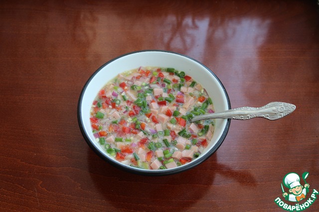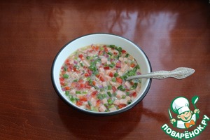 Смешайте в миске нашинкованные ингредиенты и яйца. Добавьте соль и перец по вкусу. Жидкая начинка для бутербродов готова.