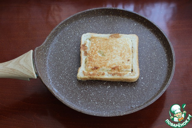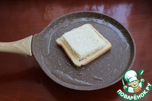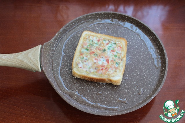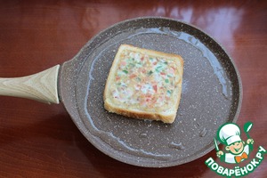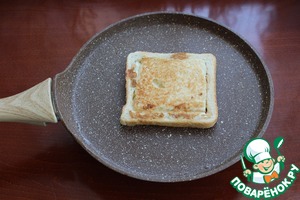 В разогретую на среднем огне сковороду влейте 1 ст. л. растительного масла и положите один хлебный квадрат. В середину квадрата влейте примерно по 2 ст. л. ложки жидкой начинки.