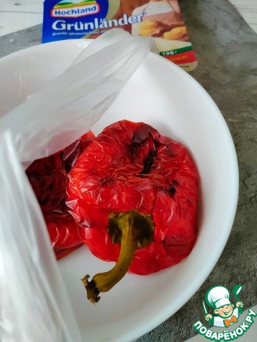 Чистые и высушенные перцы сбрызните оливковым маслом, выложите на противень и отправьте в разогретую духовку (t -180), примерно на 45 минут. Когда перцы потемнеют, извлеките их из духовки. Выложите в миску, накройте пищевой плёнкой, дайте постоять некоторое время, до остывания.