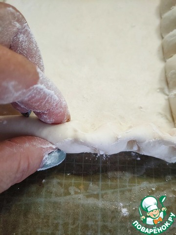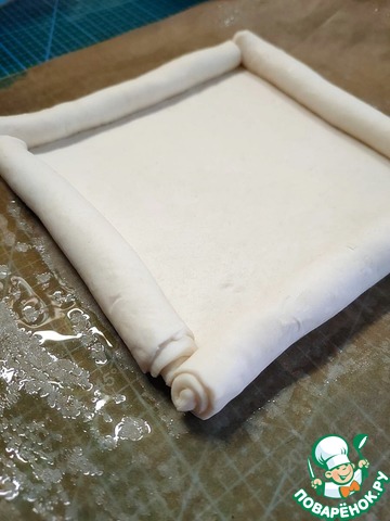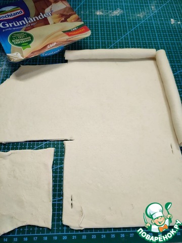 Разморозьте тесто, раскатайте так, чтобы получился квадрат 35×35. С каждого угла вырежьте квадраты, размером примерно 10х10 см.