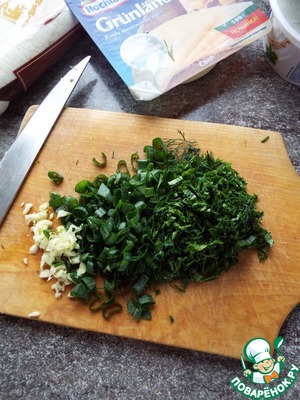 Соединить зелень и чеснок с натертым и творожным сырами.