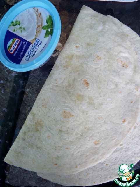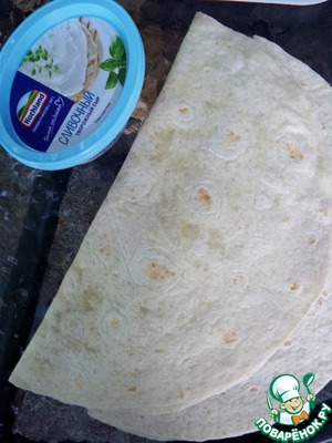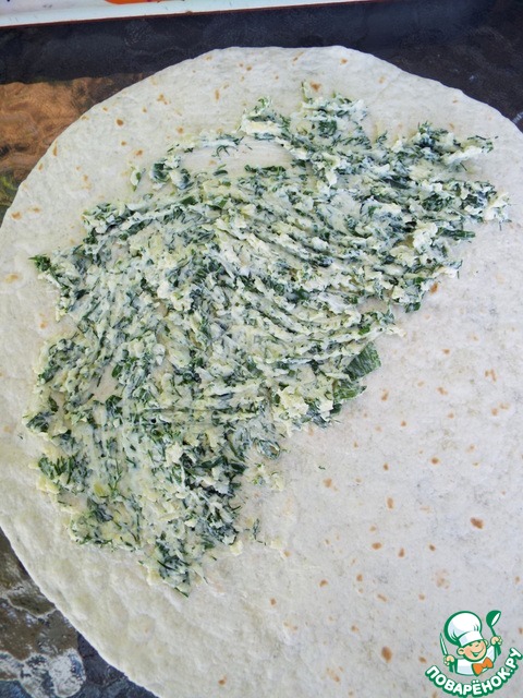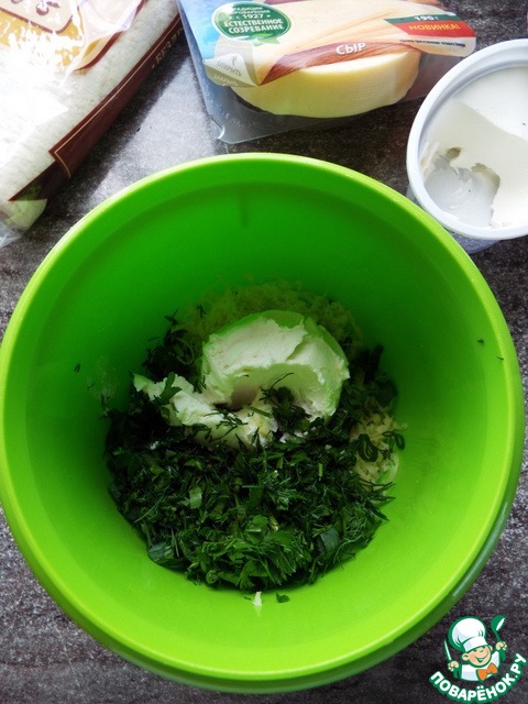 Лучше всего взять готовые круглые лепёшки или лаваш в упаковке, подойдёт даже тортилья. В качестве зелени я взяла укроп и петрушку.