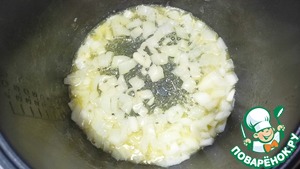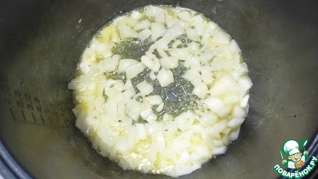 Отправляем в чашу масло и лук — Режим «Жарка» 10 минут (Не забываем перемешивать каждые 3-4 минуты).