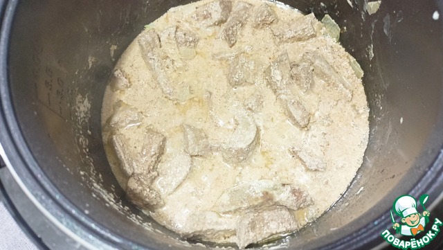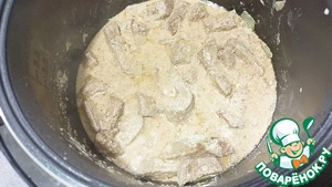 Добавляем в чашу печень и сметану - Режим «Тушение» 30 минут (При желании можете за время готовки пару раз помешать)