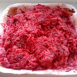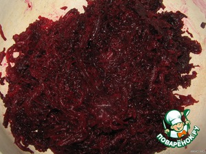 Свеклу натереть на мелкой тёрке. Свеклу я варю в пароварке (можно и просто на печке), посыпав её обязательно сахаром. чтобы она была вкуснее.