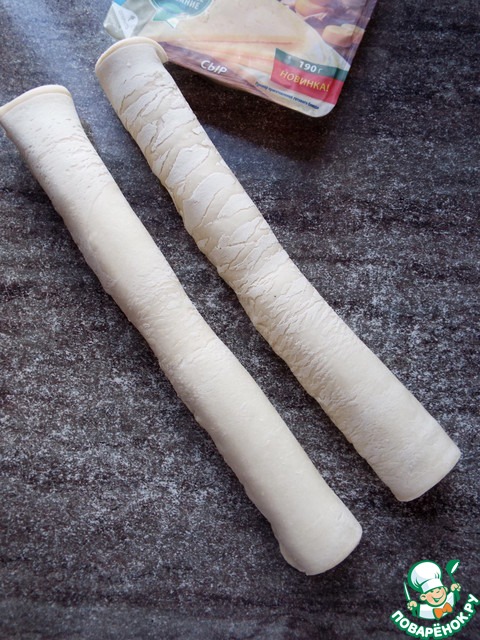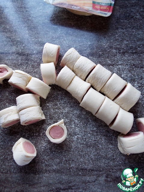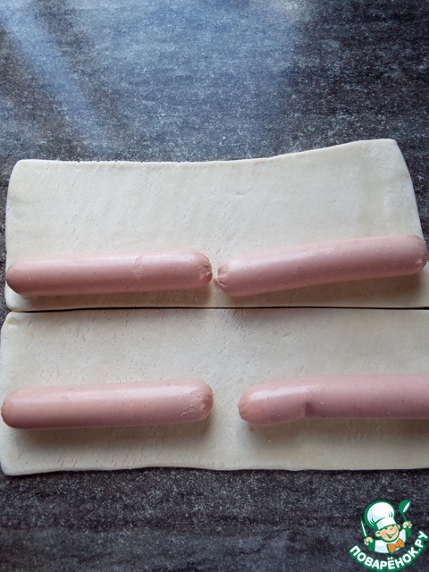 Немного раскатать. Выложить сосиски, разделив примерно пополам тесто и разрезать его.