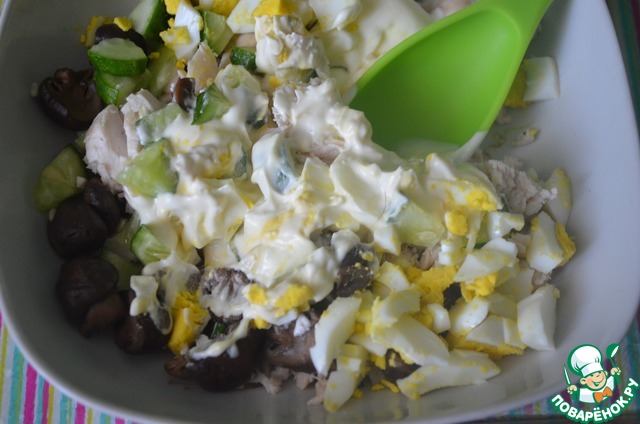 Куриное мясо, шампиньоны отварите в подсоленной воде до готовности. Нарежьте яйца, мясо, огурцы, грибы