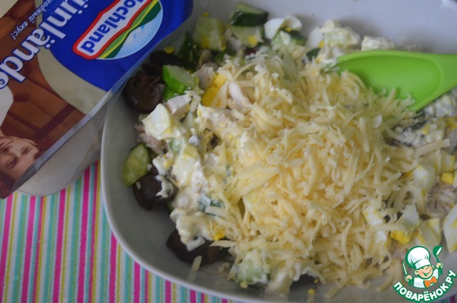 Сыр натрите на мелкой терке, заправьте майонезом.