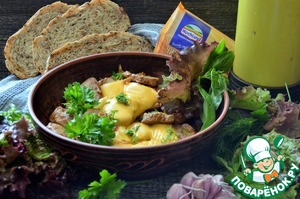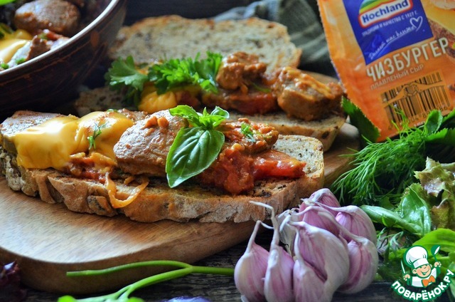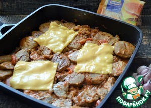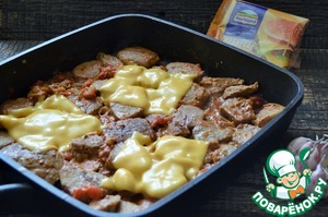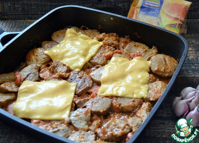 • На горячее мясо выложить ломтики плавленого сыра. Сыр я использую "Чизбургер" от ТМ Hochland.