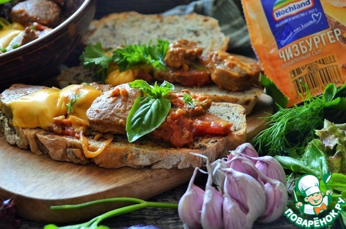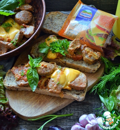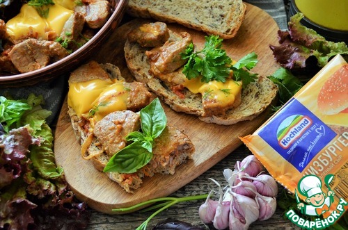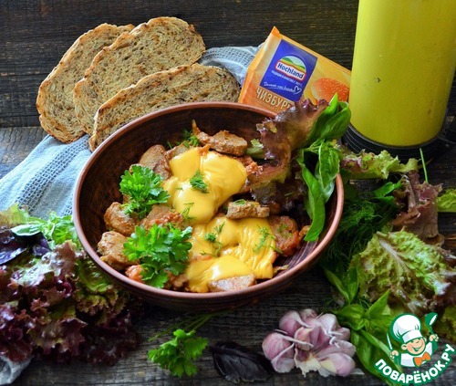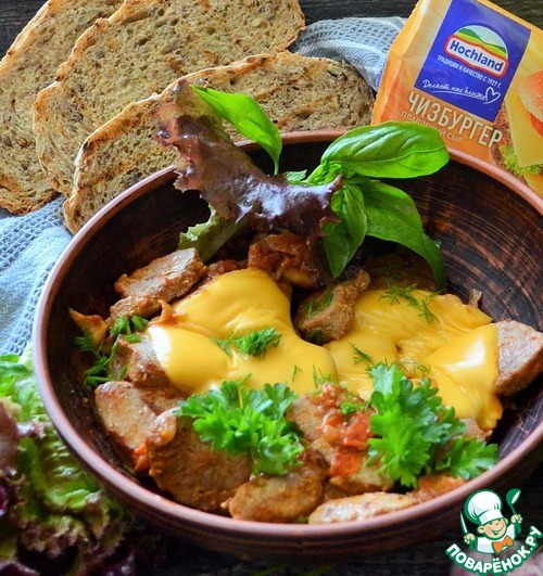 На горячее мясо выложить ломтики плавленого сыра. Сыр я использую "Чизбургер" от ТМ Hochland.