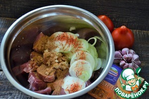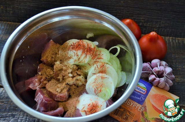 • Нарезать вырезку на "пятаки", 1-1,5 см., добавить кольца лука, рубленый чеснок, специи и соль, перемешать и оставить на 1-12 часов.