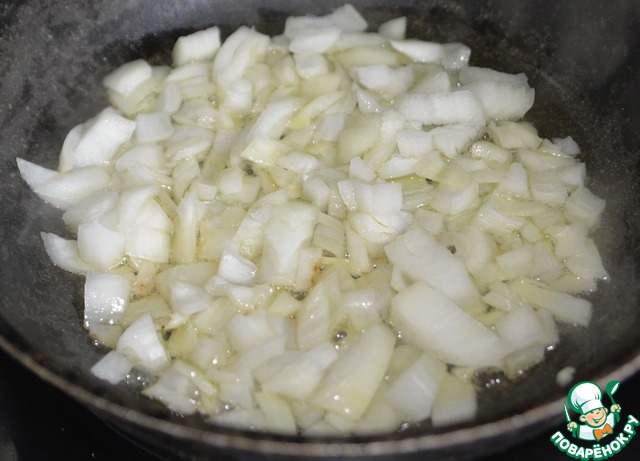Для приготовления берём сковороду с высокими бортами, казан или сотейник. Как вариант, можно готовить и в мультиварке. Обжариваем лук на растительном масле до прозрачности на среднем огне, около 2 минут.