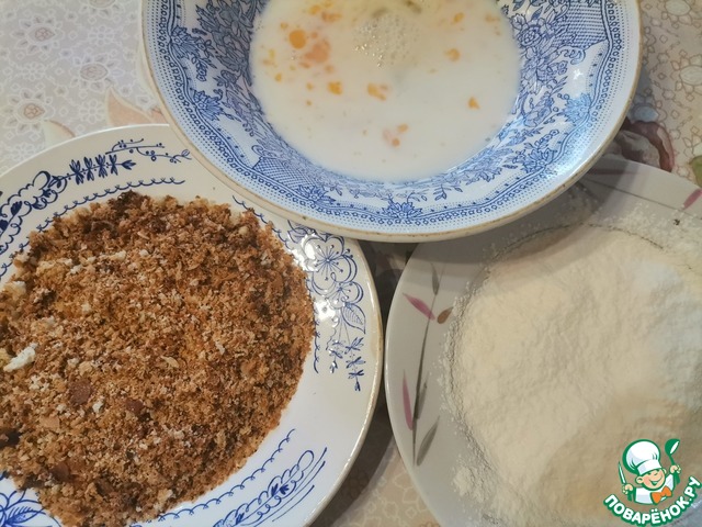 Подготовим все ингредиенты для панировки. Яйцо смешаем с молоком и слегка подсолим. В тарелки насыпем муку и панировочные сухари.