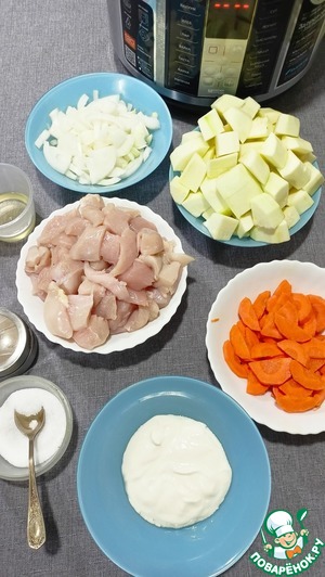 • Курицу и кабачки режем средними кусочками. Лук и морковь мелкошинкуем.